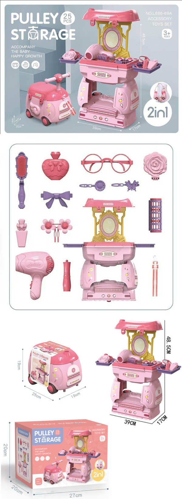 美妝套裝包括:鏡子、吹風機、仿香水、口紅等。 這個化妝組有很多配件,讓你的孩子忙碌幾個小時的樂趣。
