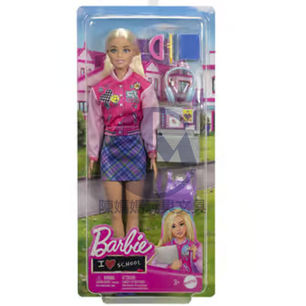 ★芭比娃娃已準備好以酷炫的學校外觀上課。孩子們可以在真正打開的背包內存放較小的物品,例如鉛筆、筆記本和量角器。其他物品包括筆記型電腦和耳機。娃娃穿著格子裙和粉紅色夾克,帶有時尚的補丁細節
