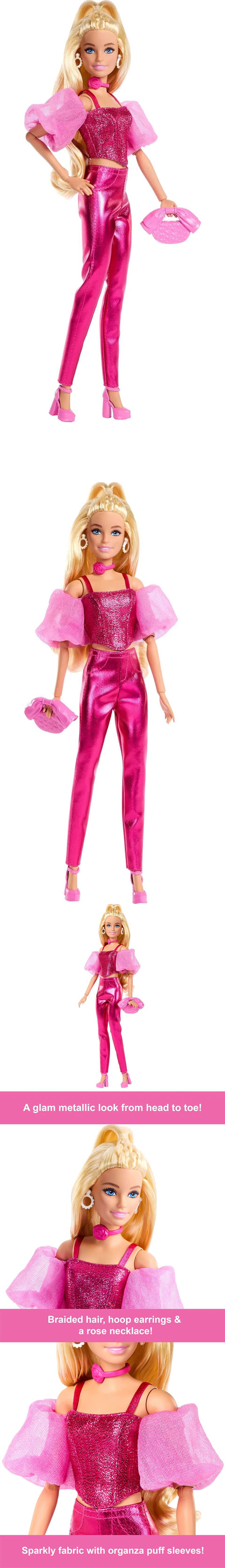 ★這個芭比娃娃從頭到腳都閃耀著粉紅色光芒!她閃亮的金屬緊身胸衣上衣,與輕盈如空氣的歐根紗袖子相得益彰,彷彿「飄」在她的肩膀上