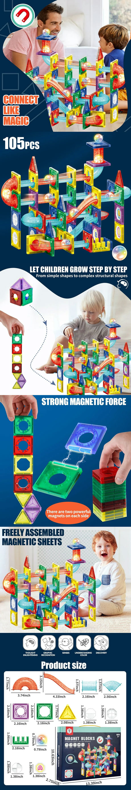 ★包含色彩鮮豔的磁性磚、磁管和斜坡,可用於建造刺激的彈珠賽道。孩子們可以創造無窮無盡的3D賽道,同時也能提升STEM(科學、技術、工程和數學)技能、創造力和空間推理能力