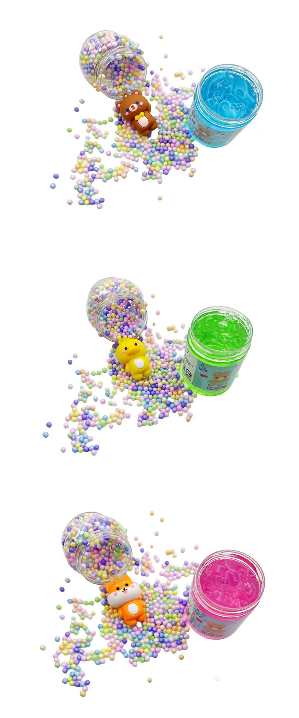★史萊姆顏色透亮,採用新穎小熊造型的雙開瓶設計,超可愛,下面是史萊姆,上面是馬卡龍顏色的保利龍球和隨機款公仔一隻